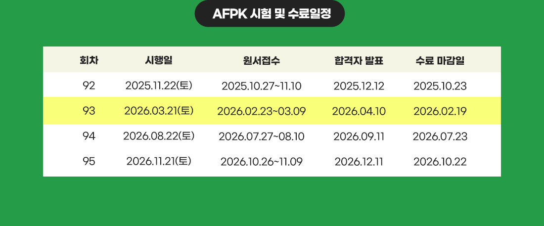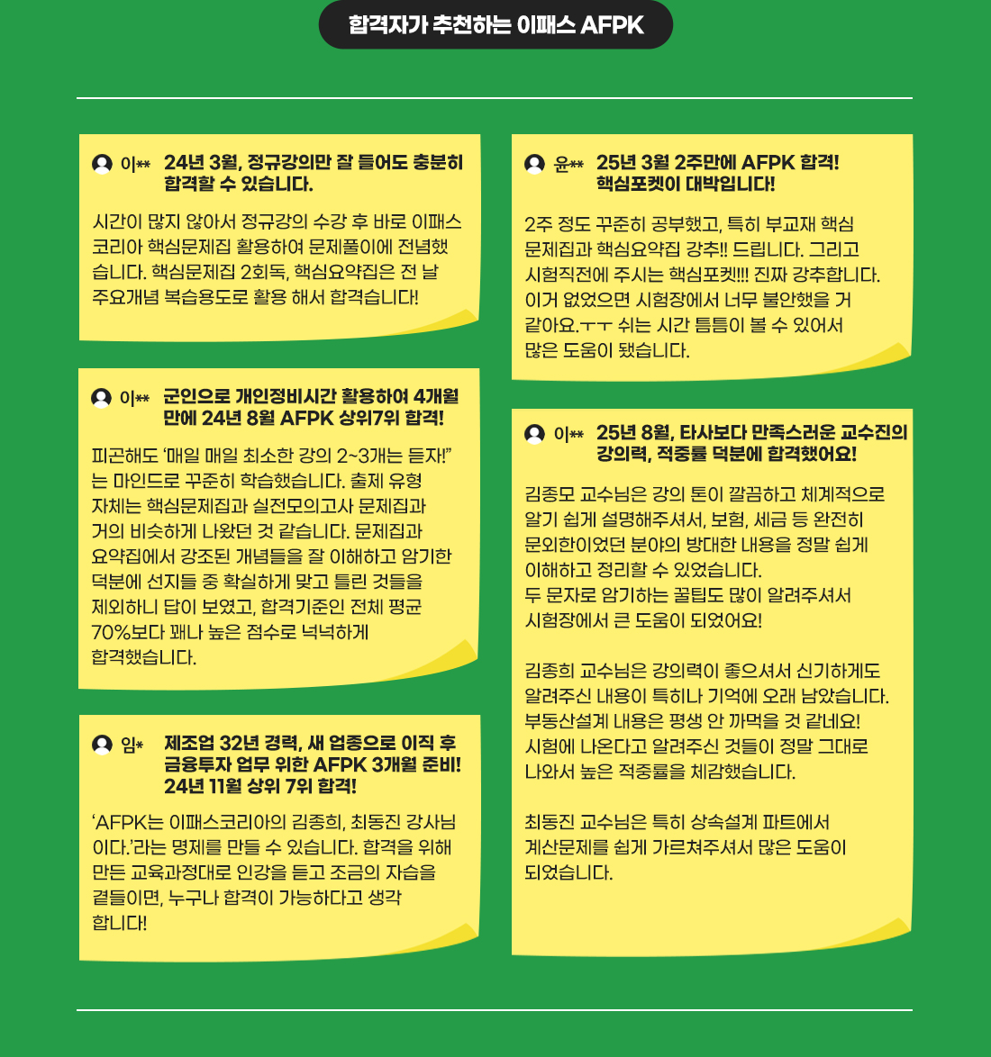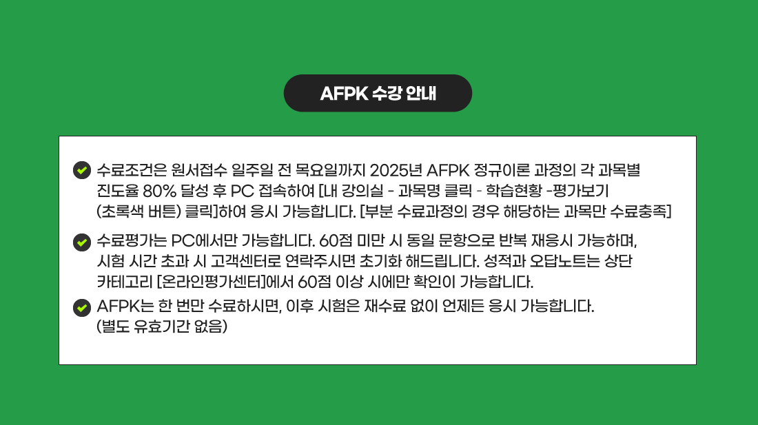 *AFPK과정의 경우 환불요청 시점에 따라 AFPK기본서 정가(118,000원), 수강차시 차감, 선불택배비(3,000원), 왕복택배비(6,000원) 차감 후에는 환불금액이 적거나 없을 수 있습니다. [수료안내] - 2026년 3월에 시행되는 AFPK시험 응시를 위해서는 원서접수 일주일 전 목요일까지 과목당 진도율80%이상, 과목당 평가 60점이상 되어야 합니다. - 온라인평가는 PC에서만 가능하며 내 강의실-학습현황-평가보기에서 확인이 가능합니다. 자세한 안내는 과정공지사항을 확인하여 주세요. [모바일 수강안내] ◎ 모바일동영상강의는 아이폰 및 안드로이드 계열의 스마트폰과 태블릿 PC에서만 가능합니다. ◎ 이패스코리아의 모바일서비스는 Wi-Fi를 권장하며, 데이터 이용시 수신지역에 따라 동영상 끊김현상이 발생할 수 있습니다. ◎ 모바일 서비스에는 데이터 통신료가 포함되어 있지 않으니 통신사별 요금제를 반드시 확인하시기 바랍니다. ◎ 모바일 기기는 휴대폰과 태블릿PC(아이패드, 갤럭시탭 등) 포함하여 2대의 기기까지 등록가능합니다. ※ 한 차시를 클릭한 경우 차시에 대한 모든 내용을 수강하지 않아도 수강한 것으로 간주합니다. ※ 수료보고가 완료된 경우 수강기간 및 수강차시가 남아있어도 환불이 불가합니다. ※ 과정에 포함되어 제공되는 FPSB 기본서만 별도 환불은 되지 않습니다. |