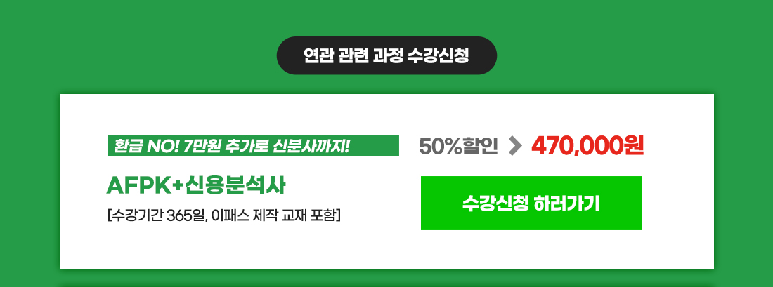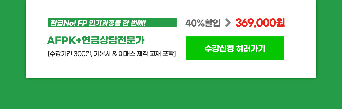 *AFPK과정의 경우 환불요청 시점에 따라 위약금, AFPK기본서 정가(118,000원), 부교재 정가 차감 및 수강일수, 선불택배비(3,000원), 반품 시 왕복택배비(6,000원) 차감 후에는 환급금액이 적거나 없을 수 있습니다. ※ 한 차시를 클릭한 경우 차시에 대한 모든 내용을 수강하지 않아도 수강한 것으로 간주합니다. ※ 수료보고가 완료된 경우 수강기간 및 수강차시가 남아있어도 환불이 불가합니다. ※ 과정에 포함되어 제공되는 FPSB 기본서만 별도 환불은 되지 않습니다.